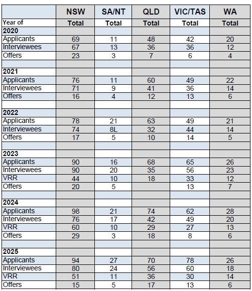 The table below shows historic data of applicants, interviews and offers by region for the last six years with a breakdown of male and female applicants.